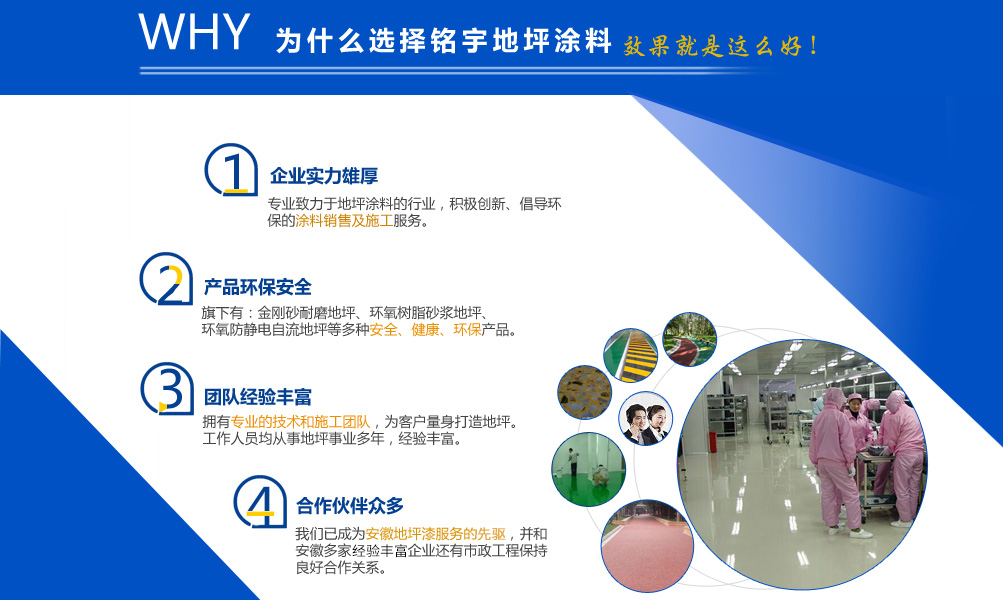 安徽銘宇建材科技有限公司是一家致力于地坪涂料的行業,旗下有金剛砂耐磨地坪,環氧樹脂砂漿地坪,環氧防靜電自流地坪,停車場防滑地坪,混凝土密封固化劑和丙烯酸球場,無震動止滑車道、塑膠跑道、工廠地板漆等工程施工服務?! {借本身的技術能力和研發條件,加上多年對環氧地坪和耐磨硬化地坪等各類工業地坪的涂裝、施工的實踐經驗、技術己處于國內專業水平,經檢測機構檢驗符合相應的技術標準。同時安徽銘宇建材科技有限公司還組建了經驗豐富的工程技術隊伍以及工程施工隊伍、簡歷了完善的售后施工服務體系,滿足用戶的需要。   安徽銘宇建材科技有限公司是一家積極創新、倡導環保的涂料銷售及施工服務的廠家,安徽銘宇建材科技有限...